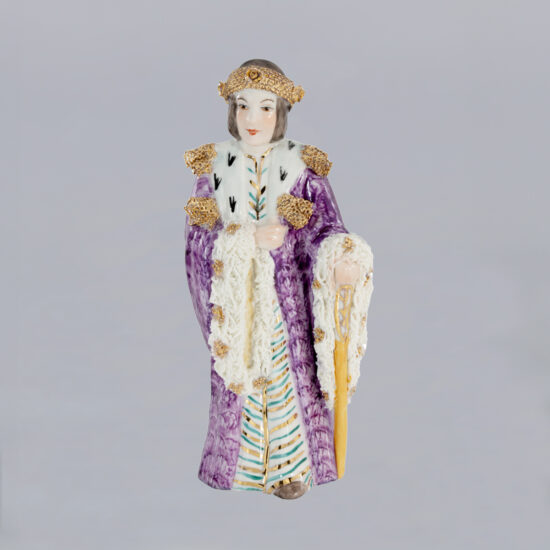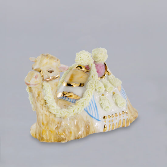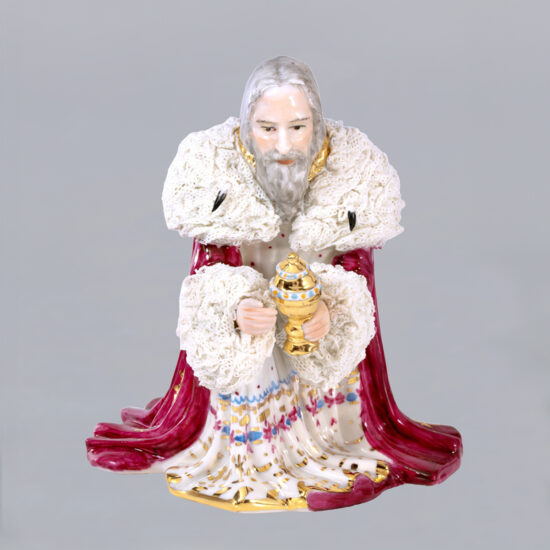Balthazar of the 3 wise men is part of Irish Dresden’s Nativity Set, made of very fine porcelain. Cotton net lace dipped in porcelain clay decorates the edge of his royal cloak and shoulders. Our trained artists apply special mixed porcelain paint to Balthazar’s cloak and head dress. 8 carat gold is painted on the cruet containing the gift. Traditionally Balthazar is referred to as the King of Arabia presenting a gift of frankincense to Jesus. A treasure for your porcelain collection! Artist: Sally