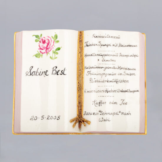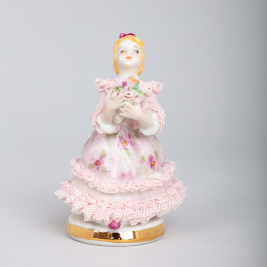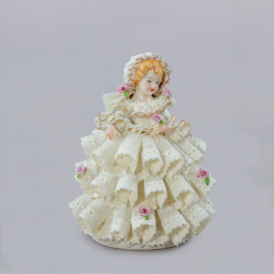 This beautiful bride is proudly walking down the aisle to her future husband. Her beautiful wedding dress is made with very fine tulle, using Irish Dresden’s expertise –dipping cotton net lace into porcelain clay and firing at a temperature of 1,290C. The material burns and leaves its pattern in the porcelain. The porcelain flowers in her bouquet are individually handmade. Our highly skilled artists use special prepared porcelain colours to paint the roses, hair and face. Fine 8 carat gold lines edges her decollté and her bouquet of flowers. This is a lovely present for the newly weds! Artist: Hans Schubert