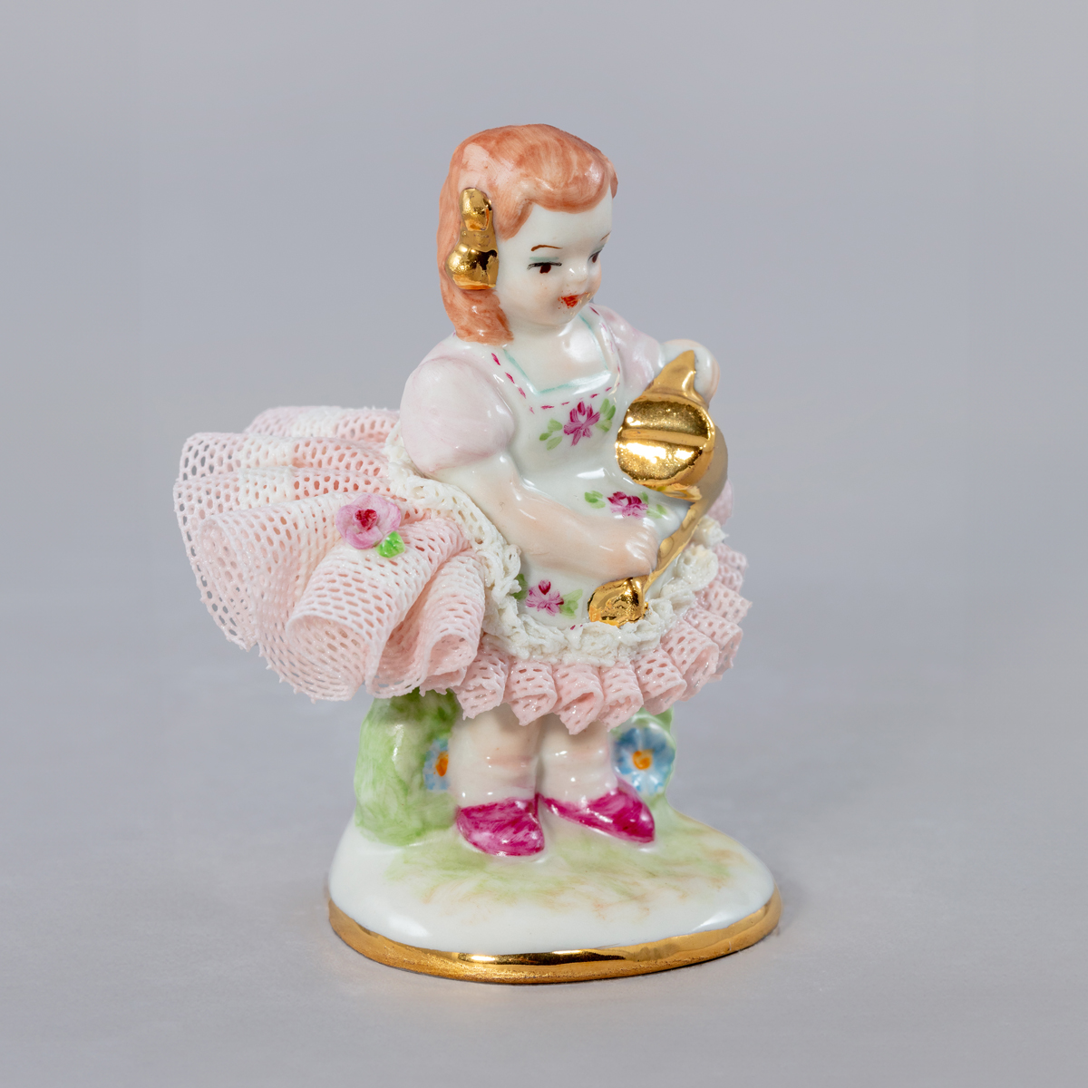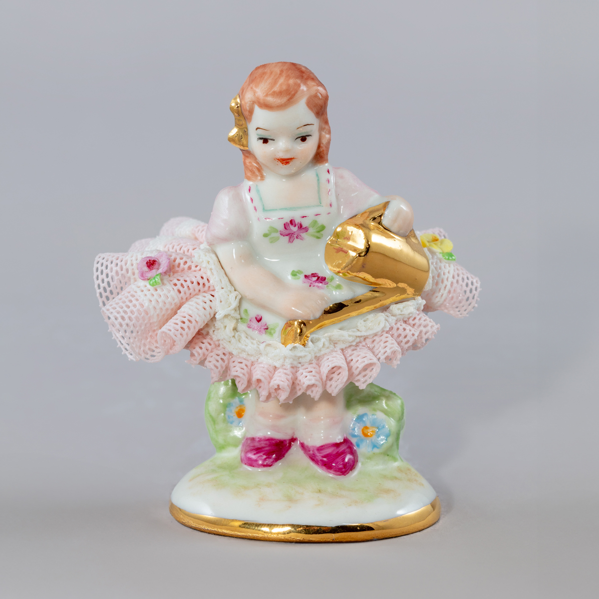 This little girl enjoys watering the flowers in her mother’s garden. Her delightful dress is made of cotton net lace dipped in porcelain clay, the cotton net burns away leaving its pattern in the porcelain during a firing temperature of 1290C. Tiny little roses hand made with porcelain clay are attached to her dress. Our highly trained artists hand paint her lovely little face with its nice smile, her hair and shoes. Small hand drawn roses decorate her apron. 8 carat gold is used on the water can and on the base. Maeve is an ideal gift for any little girl or gardeners. Artist: Hans Schubert