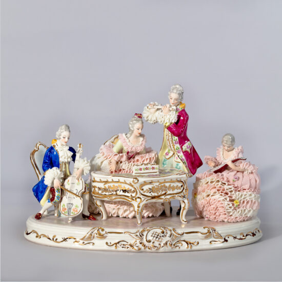 All sweetness is the demeanor of this lady in her white lace gown and pastel pink hat. Her layered dress is decorated with flowers, each carefully and individually handmade. Before the last fire (any of our Irish Dresden figurine will undertake 3 firings) our MV trademark is applied, underneath the trademark we handwrite the name of the figurine. Artist: Hans Schubert